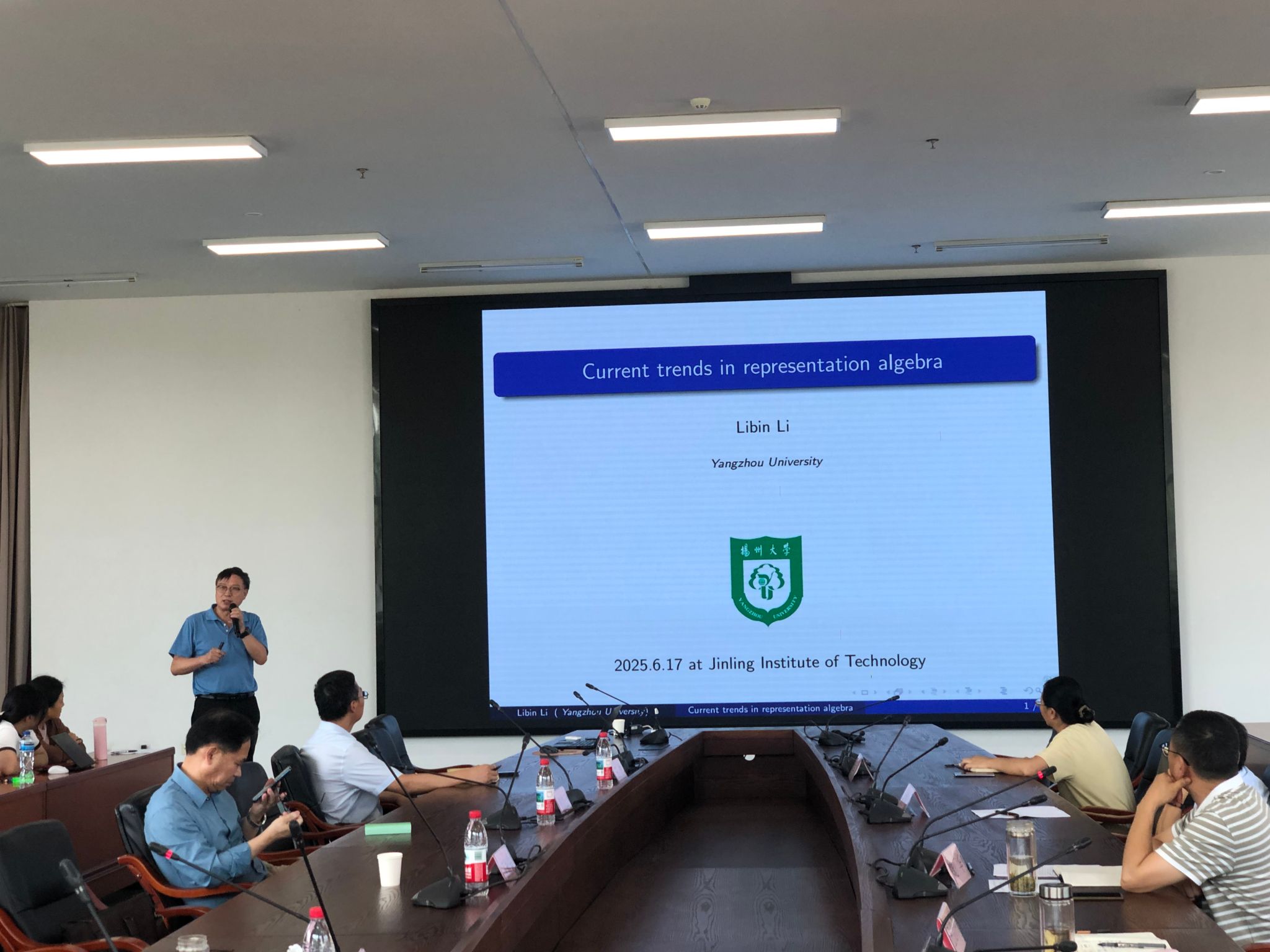 王栓宏教授作题为《Weak Algebraic Quantum Hypergroups》的报告,介绍了一类无限维代数--乘子代数上的Pontryagin对偶的最新研究进展,并以自身为例生动介绍了为发表高质量论文而开展的“八年抗战”,鼓励在座的教师和学生凡事不轻言放弃;张良云教授报告的题目是《Rota-Baxter Hopf algebras and Rota-Baxter paired Hopf modules》,介绍了Rota-Baxter Hopf代数理论的发展历程和研究热点内容;李立斌教授在题为《Current trends in representation algebra》的报告中介绍了代数表示理论的发展趋势。