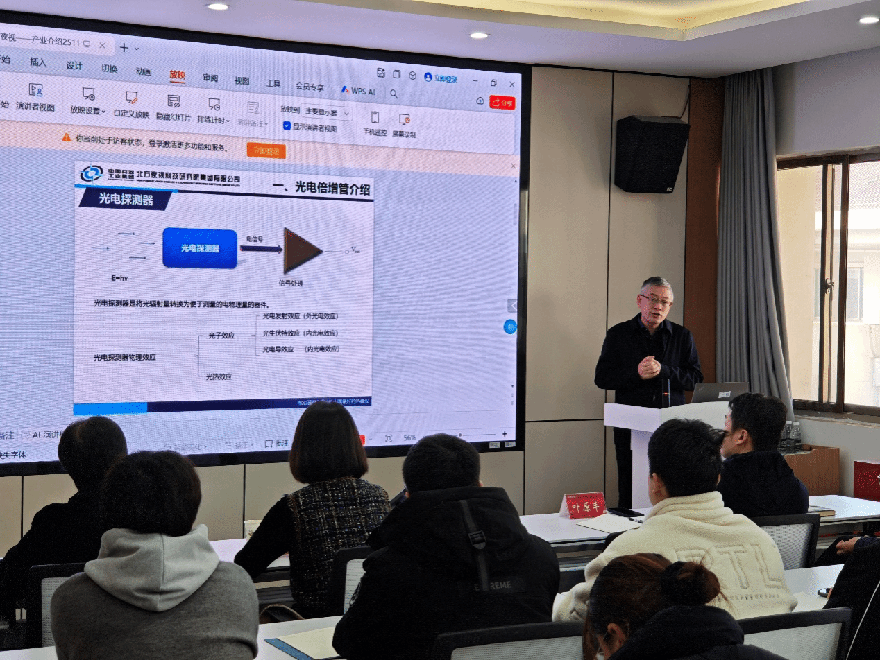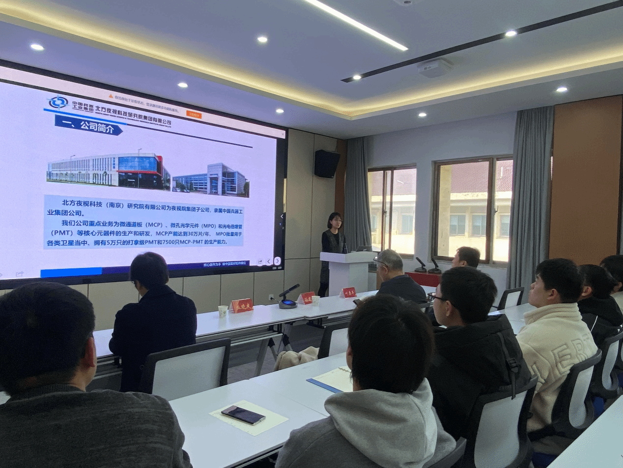 讲座环节,孙建宁以《光电倍增管产业介绍》为题,从光电倍增管的基本原理、核心特性、应用领域、北方夜视PMT产品优势及未来技术展望等方面展开深入分享,详细阐述了光电倍增管作为微弱光信号转换核心器件,在高能物理、环境监测、医疗生物、石油测井等多个关键领域的重要作用,并重点介绍了北方夜视自主研发的微通道板型光电倍增管打破国外技术垄断,满足国家大科学工程国产化需求的重大突破,累计为国家节省科研经费10亿元以上的显著成就。丛晓庆作《光电探测新器件研究进展》报告,聚焦微通道板(MCP)、微孔光学元件(MPO)、光电倍增管(PMT)三大核心器件,深入解析了飞秒激光加工、原子层沉积等新技术在器件性能提升中的应用,展示了北方夜视在光电探测领域的前沿研发实力与技术创新成果,让在场师生对行业前沿动态有了全面认识。