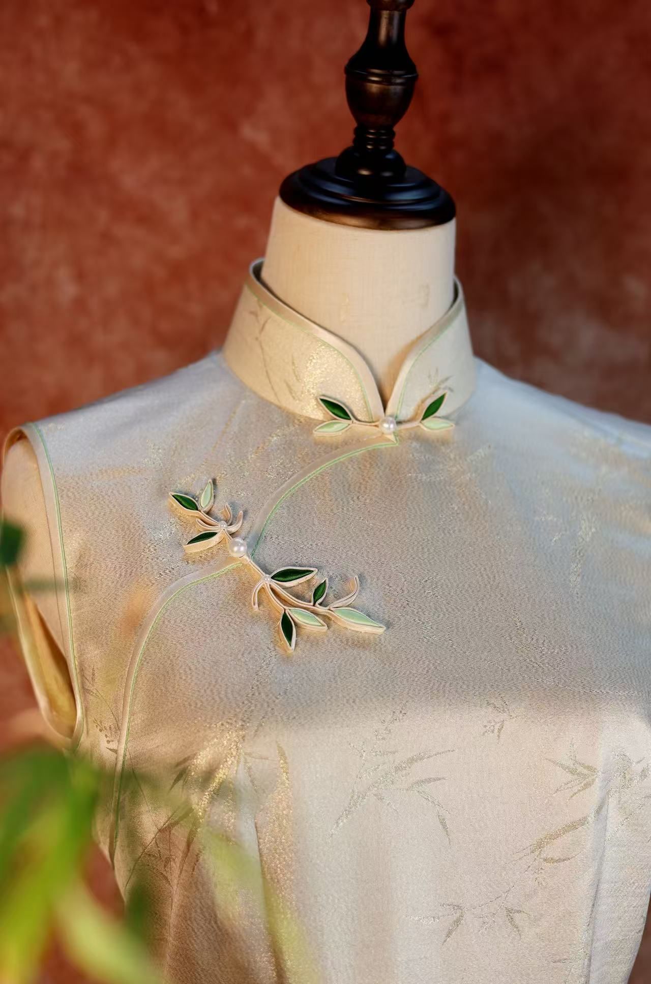 这份匠心,藏在每一处细节的考量中。旗袍精选高级天然蚕丝织金提花面料,就连里料都选用苏豪丝绸自主研发的16姆米100%桑蚕丝提花面料,既彰显中国丝绸的悠久底蕴,又兼顾穿着的舒适得体;纹样敲定“竹”元素,取其“四君子”“岁寒三友”的文化内涵,寄托“节节高升”“竹报平安”的美好愿景,践行“图必有意,意必吉祥”的设计理念;经典无袖立领搭配手工竹叶盘扣,浅绿与深绿的撞色提亮层次,领口、门襟的琨边与线香滚工艺,更将非遗技艺的精妙展现得淋漓尽致。