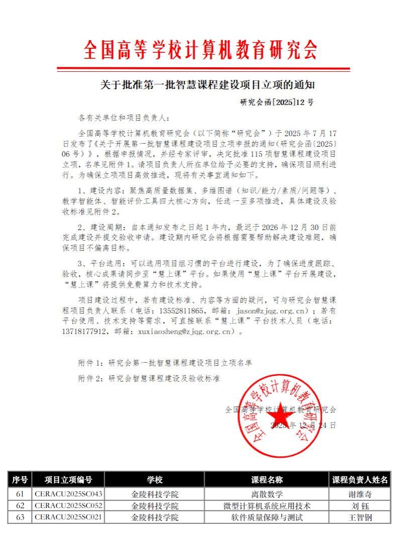 近日,全国高等学校计算机教育研究会公布第一批智慧课程建设项目立项名单,我校申报的《离散数学》《微型计算机系统应用技术》《软件质量保障与测试》等3门课程成功获批,标志着学校在推进教育数字化转型、深化人工智能与教育教学融合方面的探索获得行业权威认可。