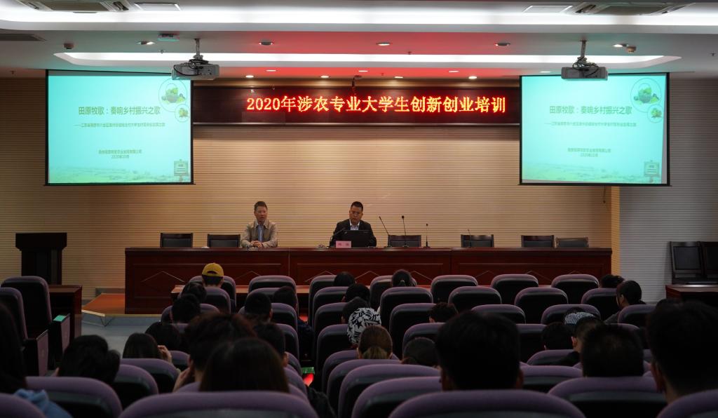 本次培训把涉农专业大四学生按学院分成养殖和种植两期培训班。第一期于2020年10月25日在幕府校区图书馆报告厅开班,围绕专业研究进展、农业产业体系建设、现代农业创业、农业生态环境建设、“互联网+”下的智慧农业、农产品市场营销(电子商务)等专题内容进行培训。继教院邀请了江苏省农业农村厅、南京市农业农村局的行业主管领导参加,农业院校知名教授、农业创新创业典型、优秀校友代表组成了授课专家团队。