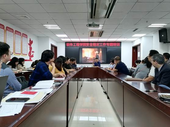 为做好学院安全稳定工作,增强学院教职工的消防安全意识,5月12日,软件工程学院邀请保卫处副处长卓士磊和江宁区消防大队教员严丹到学院进行安全稳定工作专题培训,学院全体教职工参加,会议由学院党委书记徐志国主持。