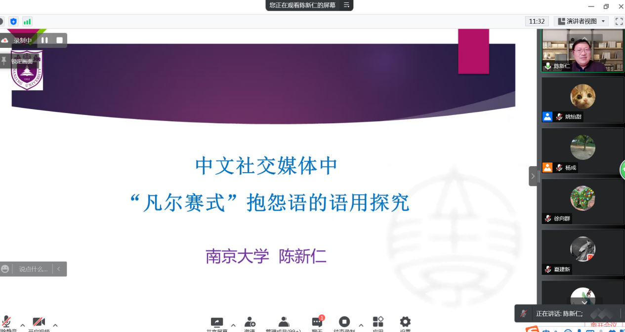 4月19日下午,南京大学外国语学院教授、博士生导师陈新仁应邀为我校师生作题为《中文社交媒体中“凡尔赛式”抱怨语的语用探究》的线上学术讲座。讲座由外国语学院副院长张志刚主持,共计500余名师生聆听了讲座。