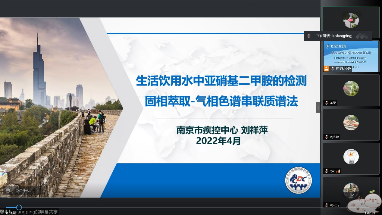 4月28日下午,南京市疾病预防控制中心主任技师刘祥萍博士应邀为我校师生作题为《生活饮用水中亚硝基二甲胺的检测——固相萃取-气相色谱串联质谱法》的线上学术讲座。讲座由理学院李静副教授主持,理学院、动物科学与食品工程学院以及相关学院师生线上聆听。