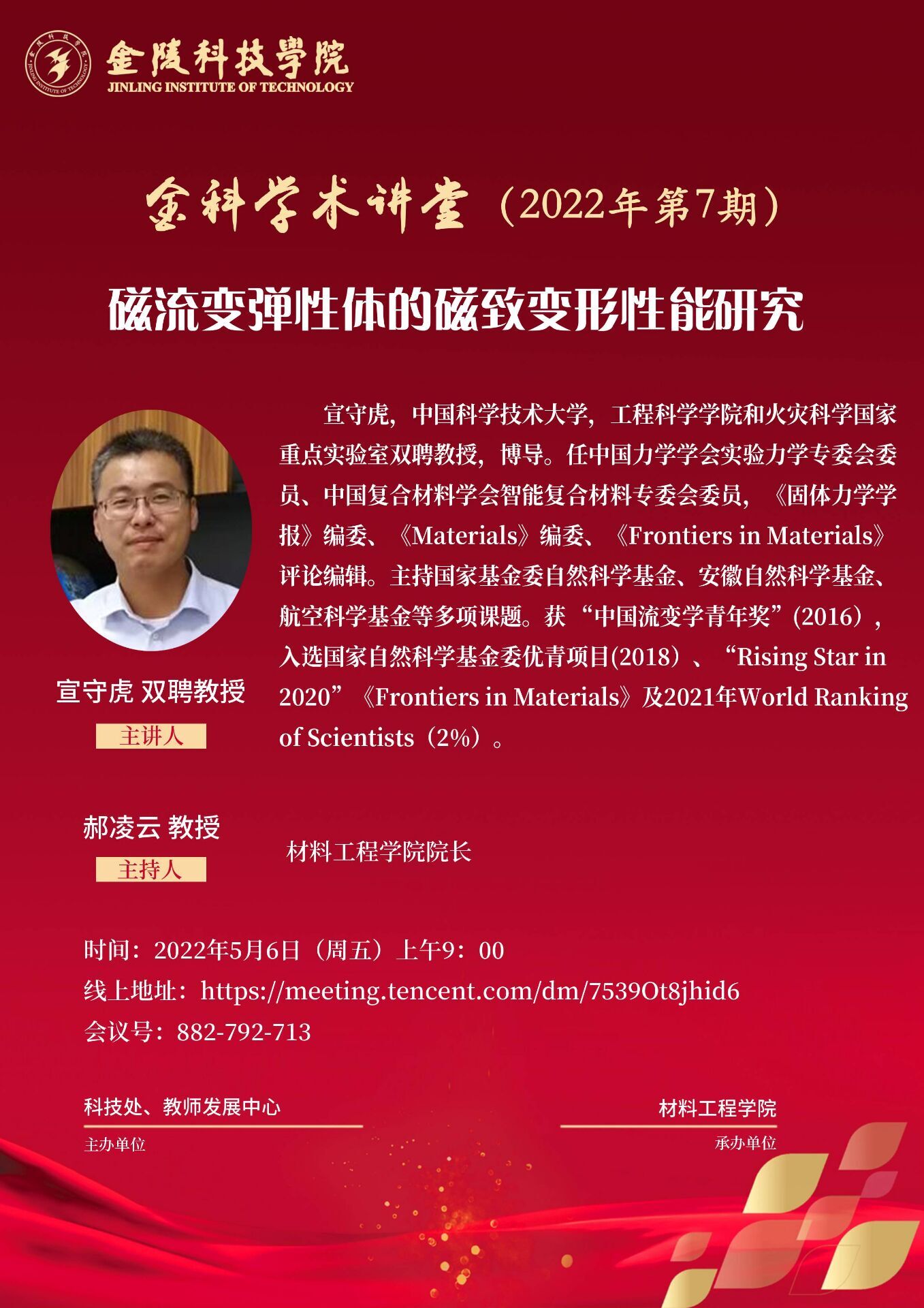 5月6日上午,中国科学技术大学工程学院博士生导师宣守虎教授应邀为我校师生作题为《磁流变弹性体的磁致变形性能研究》的线上学术讲座。讲座由材料工程院长郝凌云教授主持,共计400余名师生聆听了讲座。