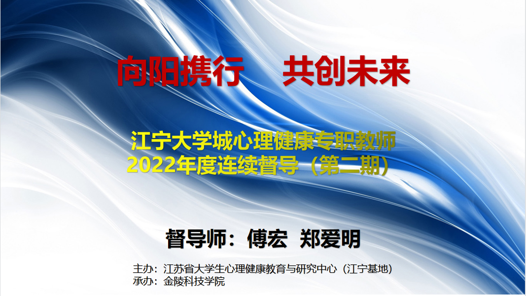 5月26日上午,由我校承办的2022年度江苏省大学生心理健康教育与研究中心(江宁基地)高校心理咨询专兼职人员网络督导活(第二期)动顺利举行。中国心理学会临床与咨询心理学专业机构与专业人员注册系统注册督导师傅宏教授和郑爱明教授担任本次督导,南京工业大学、南京信息工程大学、南京传媒学院等十余所院校的三十余位专兼职心理教师代表参加了督导。