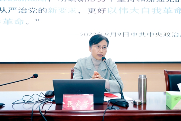 张家芳教授以《学习贯彻党的章程,深入推进自我革命》为题,从“党章引领:以伟大自我革命引领伟大社会革命”“守正创新:党章修改的基本原则与重要坚守”“不忘初心:以自我革命精神维护践行党章”等三个方面,对党的二十大修订新的《中国共产党章程》的发展过程、具体内容和重要意义作了详尽而全面地诠释与解读。她认为,党的二十大新的《中国共产党章程》充分体现了马克思主义中国化时代化的最新成果,充分体现了党的十九大以来党中央提出的治国理政新理念新思想新战略。我们一定要进一步强化和树立党章意识、纪律意识、规矩意识,以党的二十大新的《中国共产党章程》作为最基本的遵循,自觉尊崇党章,维护党章,做党章的坚定执行者和忠实捍卫者。