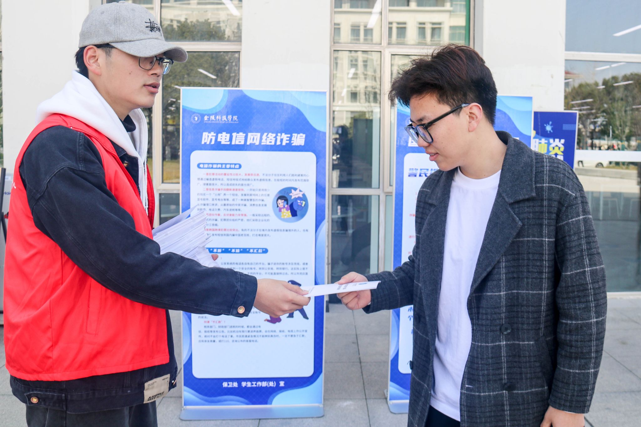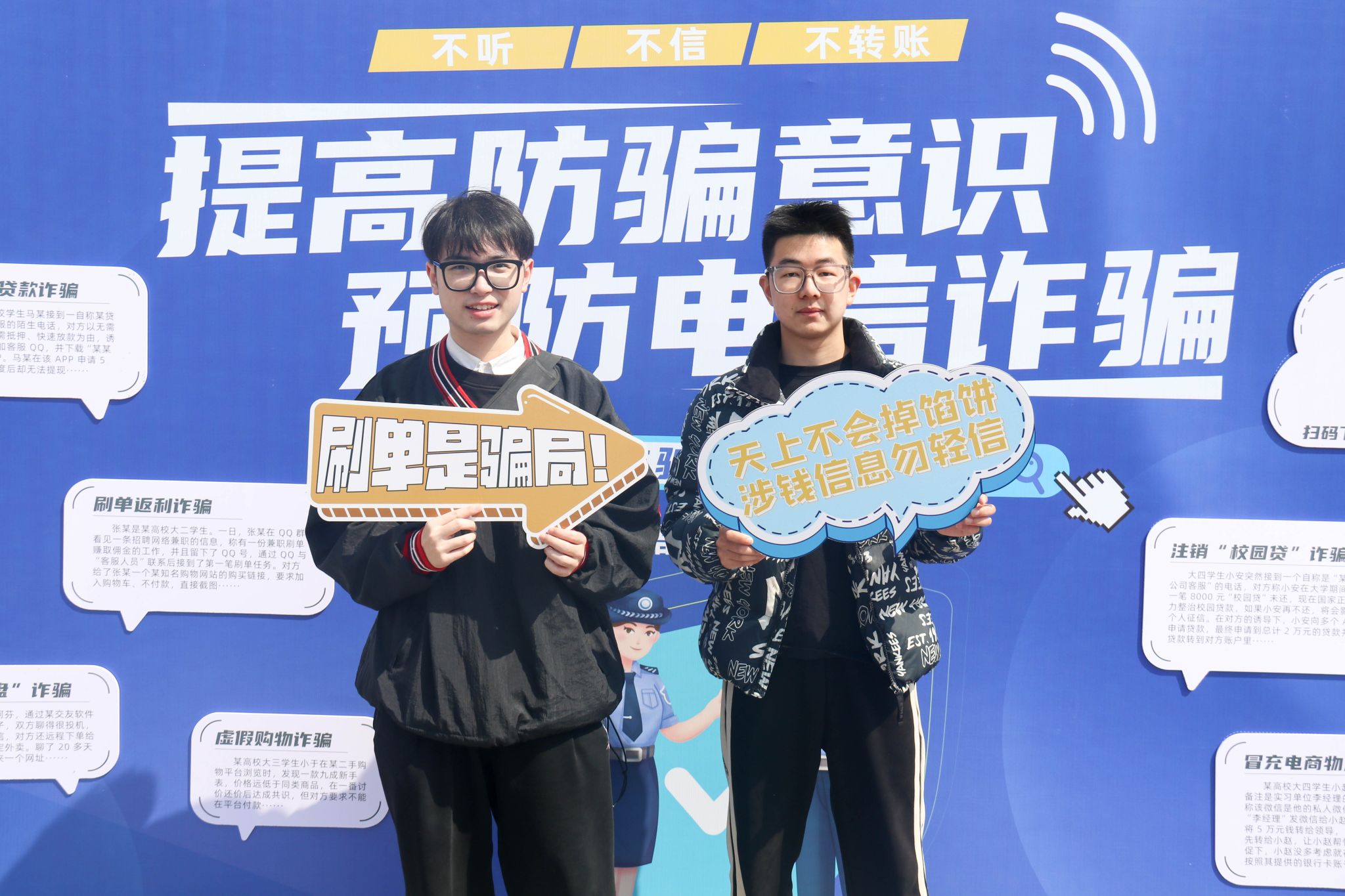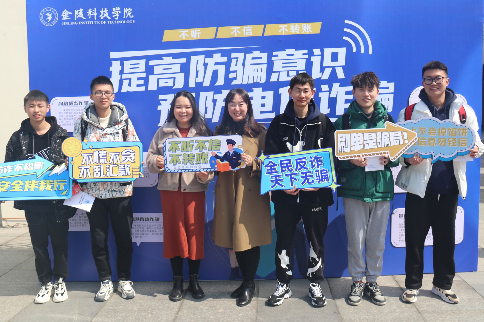 在第60个“学雷锋纪念日”即将到来之际,为提高我校全体师生“反诈防诈”的安全意识,保障师生财产安全,“防范电信诈骗,构建平安金科”主题宣传教育活动在大学生活动中心和南区食堂开展。本次活动由学工部(处)、保卫部(处)主办,网通学院协办。