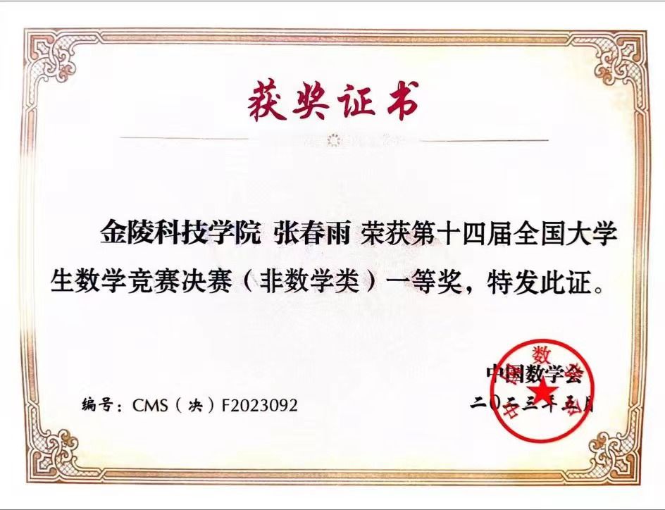 5月26日至28日,由中国数学会主办、广东工业大学和广东省数学会承办的十四届全国大学生数学竞赛决赛在广东工业大学(大学城校区)举行。共有来自北京大学、清华大学、复旦大学等1024所高校,逾23万名学生参赛,最终来自全国32个赛区的922名学生跻身本次赛事决赛。经过激烈的角逐,由理学院高等数学竞赛教师团队指导的机电工程学院19建筑电气与智能化(2)班的张春雨同学(已被南京航空航天录取为硕士研究生)荣获一等奖。这是继商学院陆潇同学于2021年荣获一等奖后,我校学生在决赛中再次斩获一等奖。