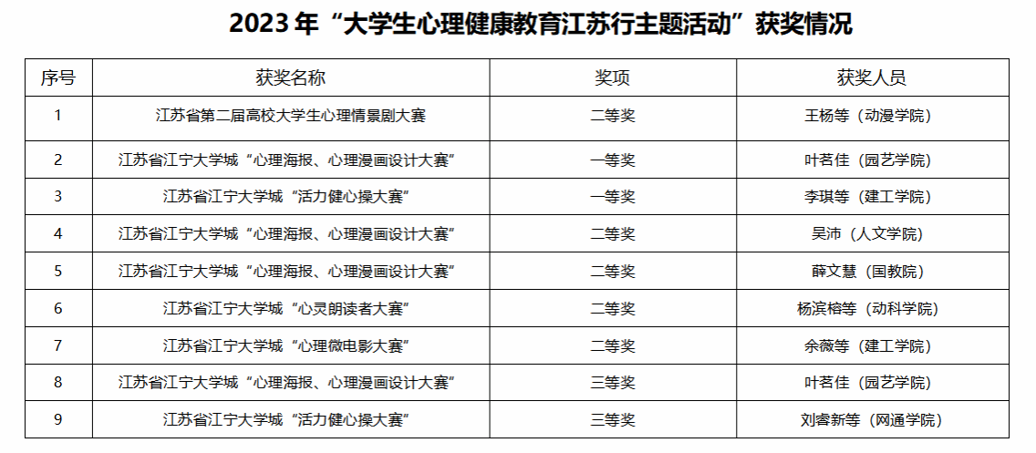 活动期间,我校组织辅导员参加了全省心理危机预防与干预工作视频会议、全省高校心理危机干预骨干教师专题培训;依托江宁大学城的区域心理健康教育资源,承办江苏省江宁大学城大学生心理健康教育研究中心的高校专兼职心理咨询师督导活动;为学生搭建省、区级心理活动平台,组织学生参加江苏省和江宁大学城各级各类比赛,获得丰富成果,提升学生心理健康水平。