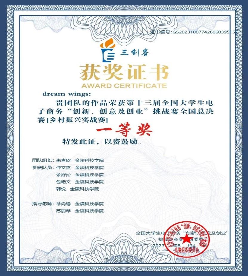 2023年3月,“dream wings”团队参加校内选拔赛,成功晋级路演答辩环节,最终获得“校赛一等奖”和“最佳创业奖”。6月,“dream wings”团队代表我校在南京邮电大学参加江苏省省赛,成功斩获省赛一等奖。之后,“dream wings”团队不断打磨PPT与演讲稿,最终在7月代表学校参加全国总决赛,荣获全国一等奖。