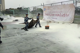 在灭火实战演练中,新生们在培训教官的指导下使用灭火器、灭火弹、水基灭火器、灭火毯等消防器材进行灭火操作,消防中队消防员展示用两支水枪扑灭熊熊大火和高空灭火。