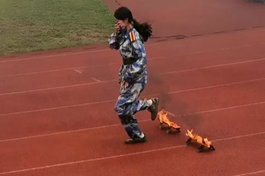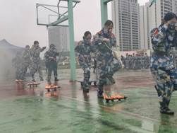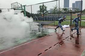 演练中,新生们学习并了解如何使用灭火器,随后听从培训教官的指挥,分批次有序展开进、出烟雾逃生屋,穿越火门,低姿进、出匍匐网,跨越火线等疏散演练。