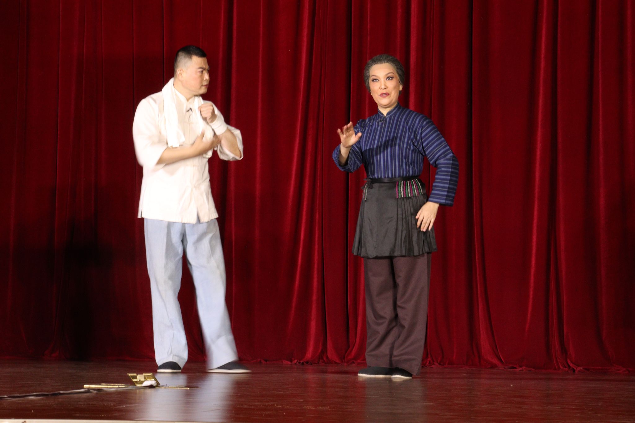 演出正式开始前,主演们带来了妙趣横生的互动环节,多位同学走上舞台跟随主演们学起了戏曲的“手、眼、身、法、步”,一板一眼,有模有样。