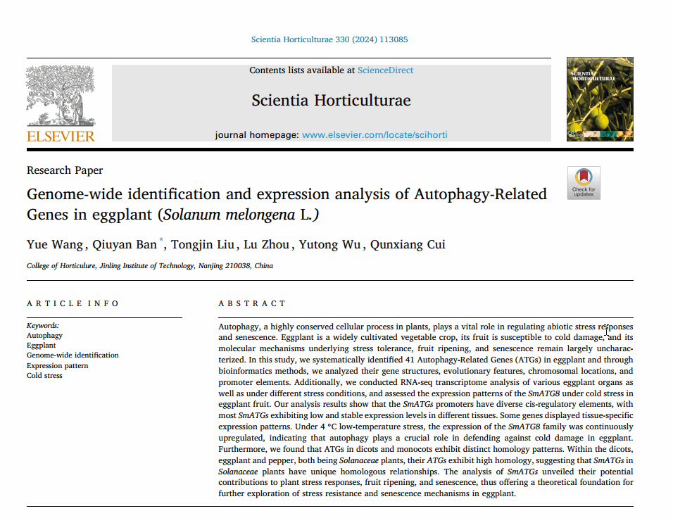 该研究以我校自主培育的特色茄子新品种‘紫优一号’为材料,研究鉴定了茄子自噬进程中的自噬相关基因(Autophagy-Related Genes, ATGs)。自噬是植物中保守的自我降解机制,在调节非生物胁迫反应和衰老中起着重要作用。本研究首次系统鉴定了茄子中41个ATG基因,阐明了这些基因在茄子的不同组织、不同逆境胁迫下具有独特的表达特性。其中,在4℃冷藏茄子果实中,SmATG8家族的表达持续上调,表明自噬进程及ATG8家族在茄子冷害发生过程具有重要作用。以上结果对探究自噬进程在茄子果实冷害中的功能和作用机理具有重要的理论意义,也为高效利用基因工程改良果实耐冷性提供重要的基因资源。