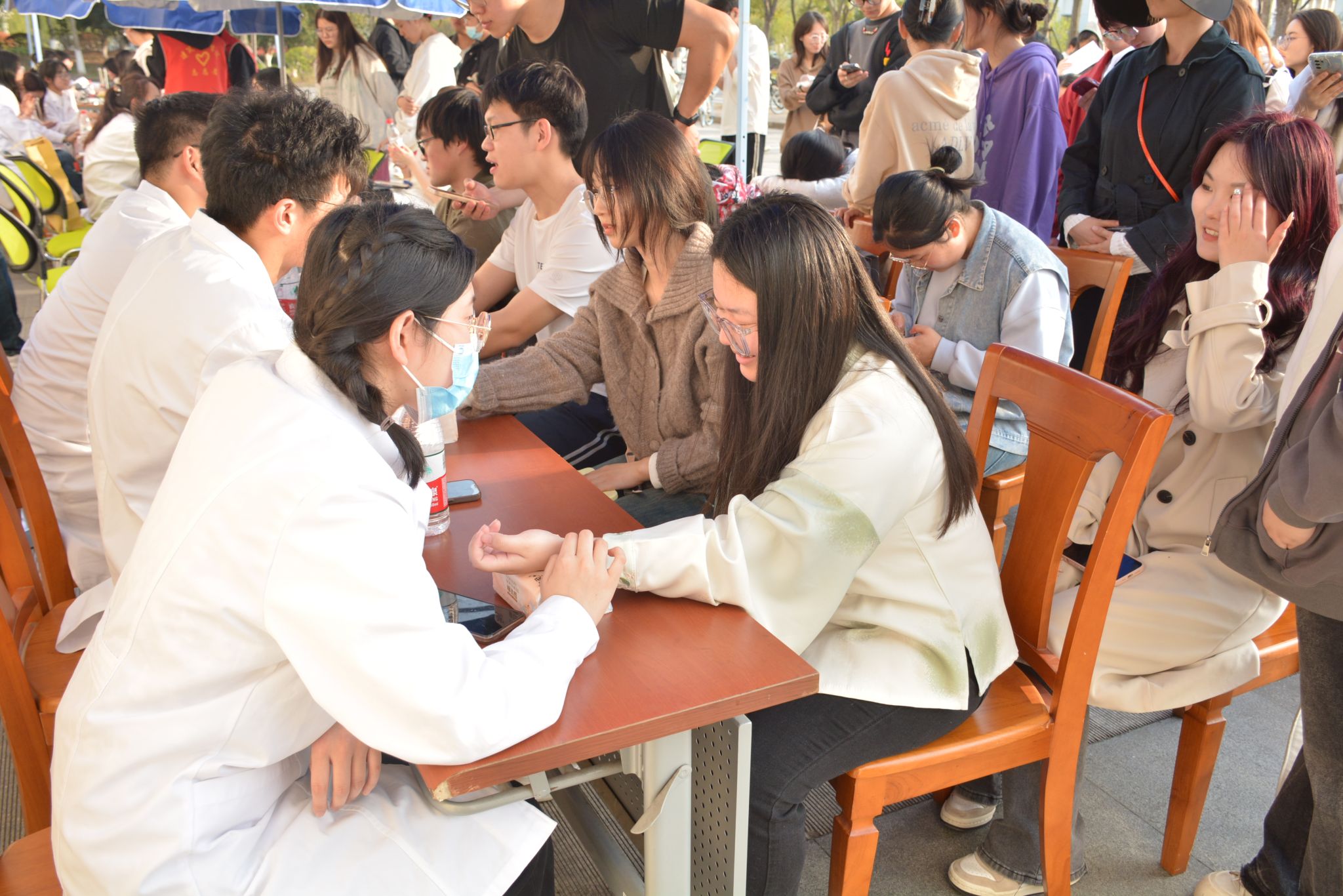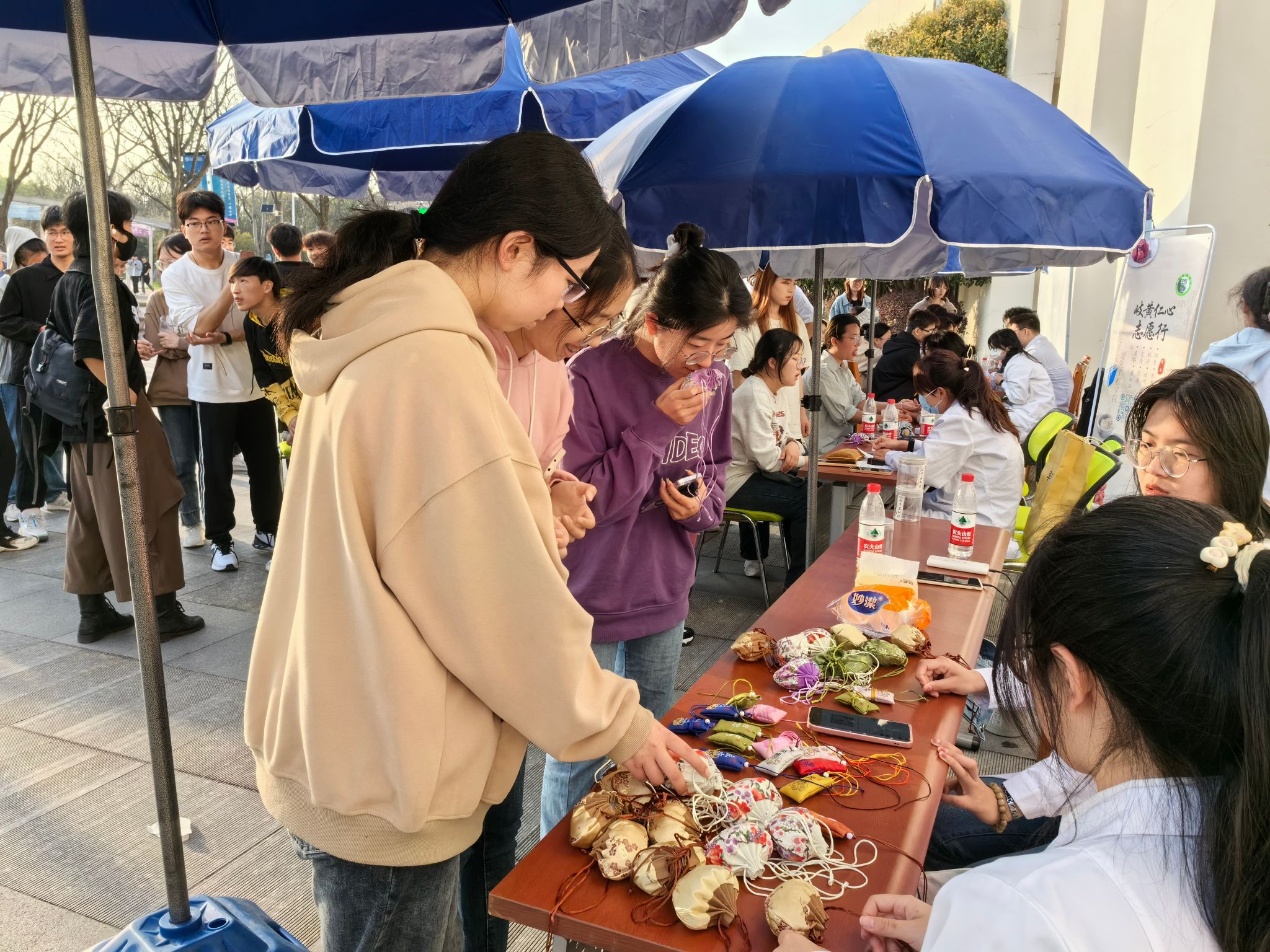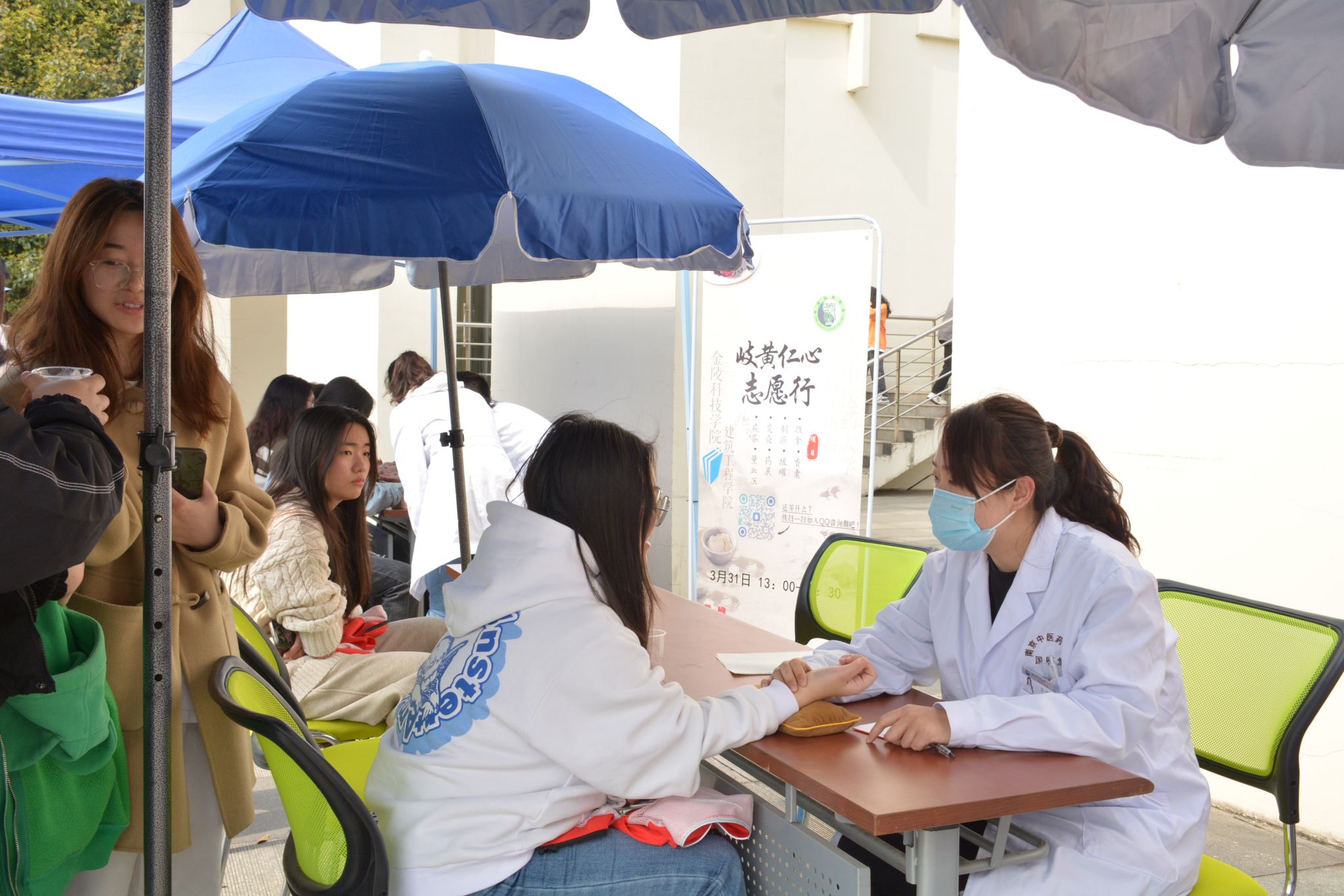 青医益行,桃李共荣。3月31日,开云在线建工学院联合南京中医药大学中医临床协会,来我校江宁校区开展医疗志愿进校园活动。南京中医药大学的志愿者为金科院学生提供了量血压、香囊制作、推拿、艾灸、品尝花茶等服务,中医学科的魅力吸引了大批同学前来体验学习。