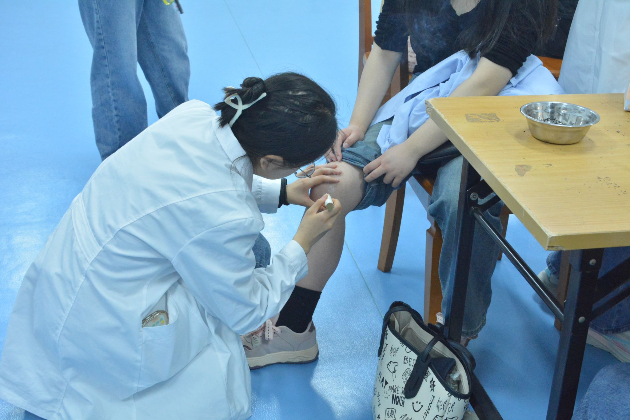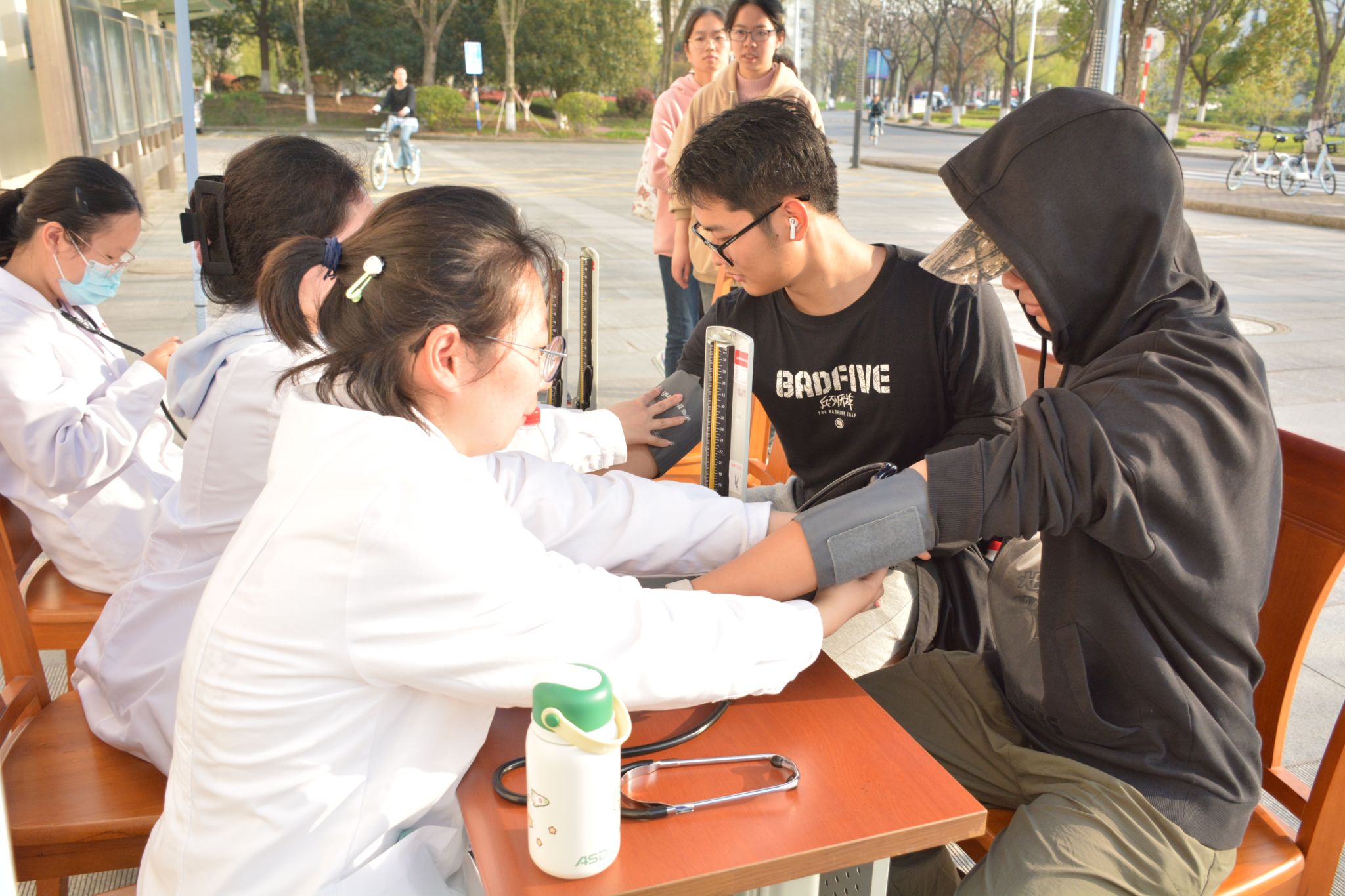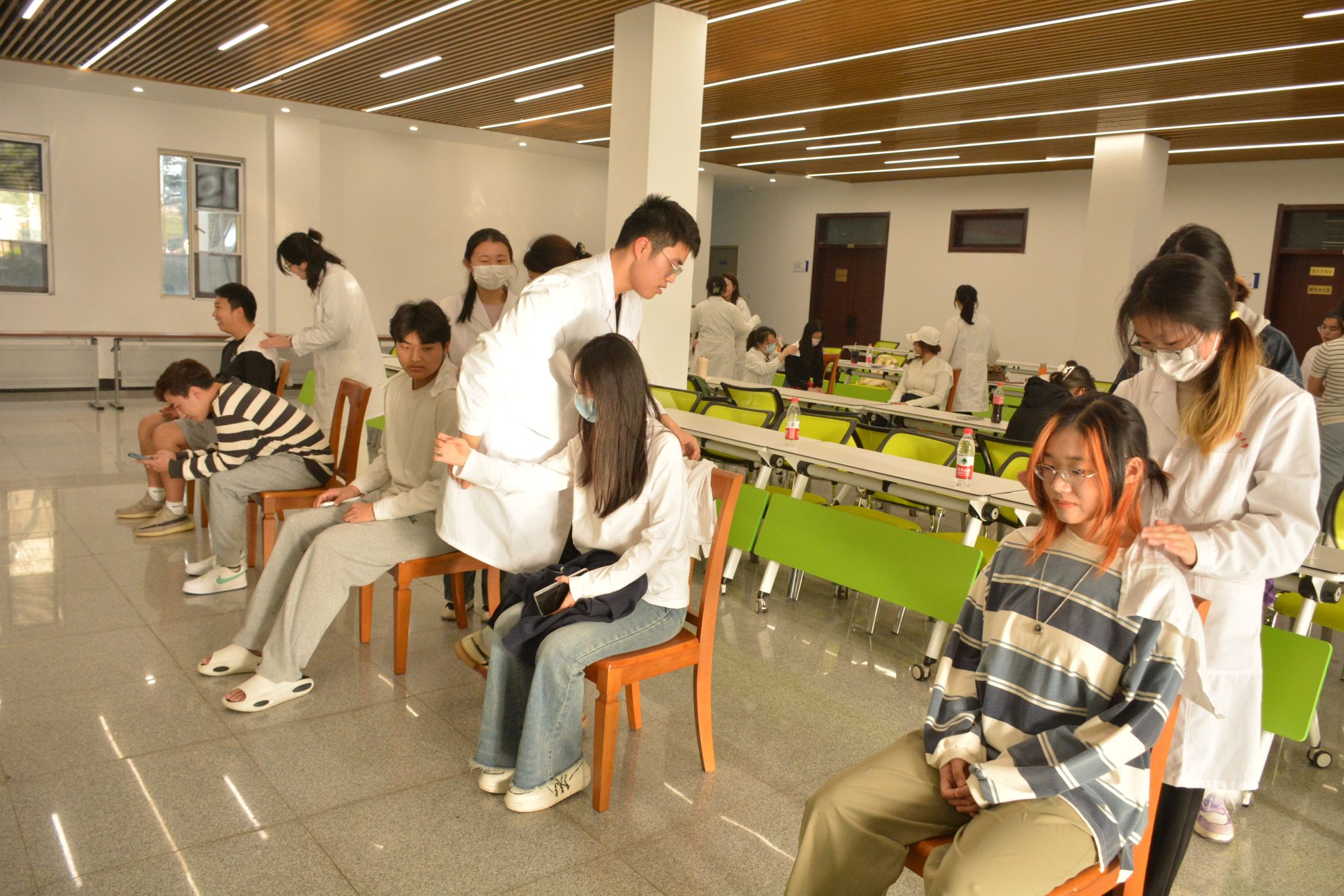 志愿者们细心地为我校就诊同学量血压、细致地讲解了药材的作用,并推荐了几种适合大部分同学的配方,义诊志愿者针对同学们长时间久坐、低头等引起的肩颈和腰部问题,为我校同学进行了专业的中医推拿,帮助同学们疏通经络、放松肌肉、减轻身体压力。