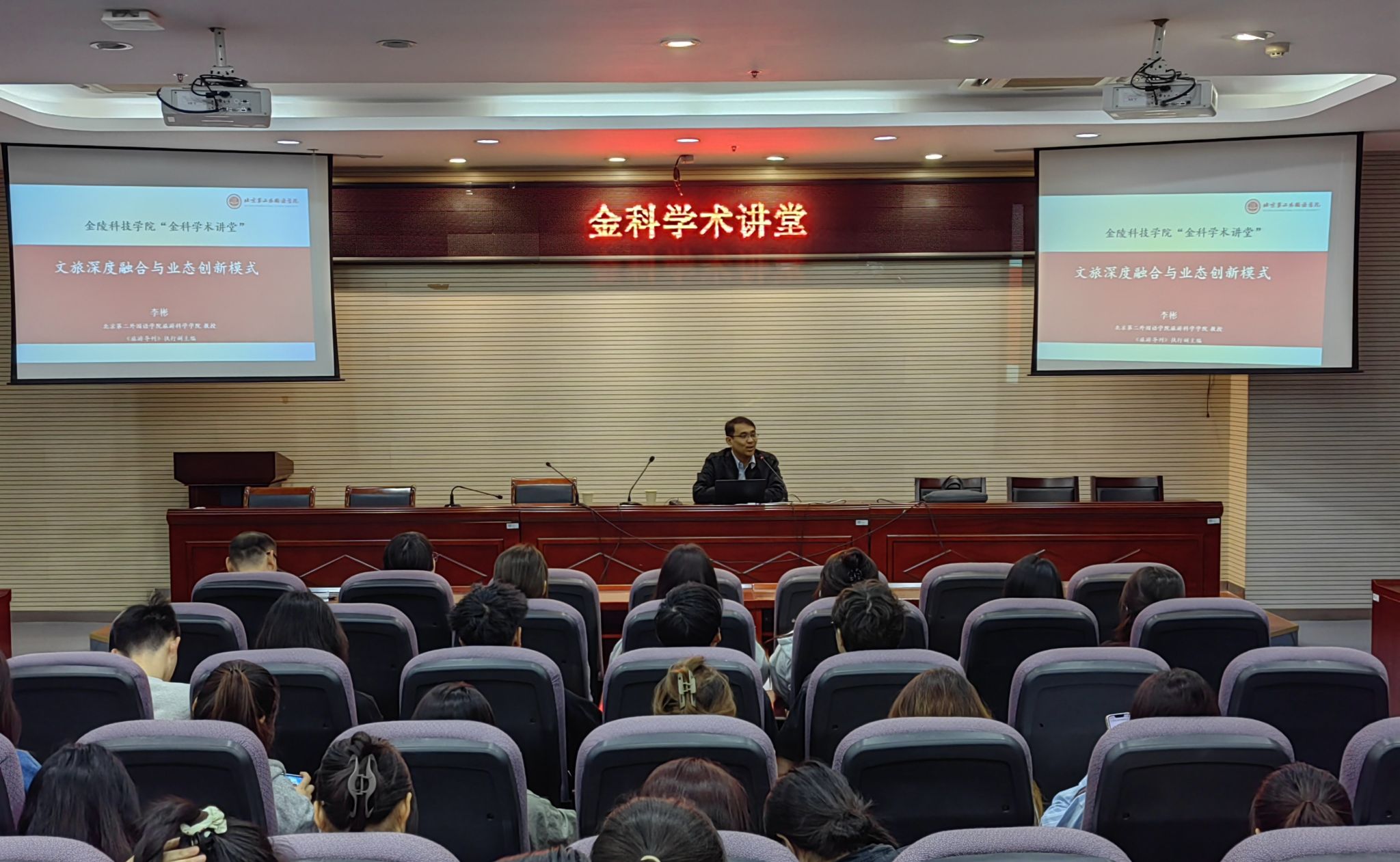 4月11日,由科技处、教师发展中心主办,人文学院承办的第五期“金科学术讲堂”在幕府校区图书馆报告厅顺利开讲。本次学术讲堂特邀北京第二外国语学院旅游科学学院副院长李彬教授作题为《文旅深度融合与业态创新方向》的学术报告,学院近150名师生参加。人文学院院长张维亚教授主持本次讲座。
