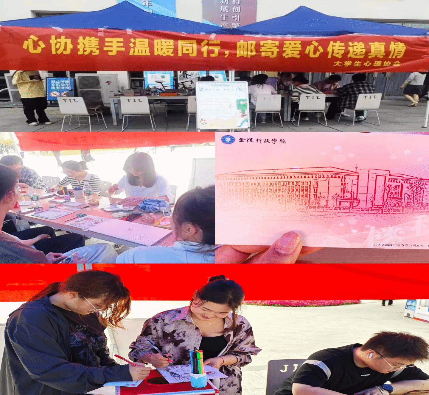 为贯彻落实《省教育厅关于组织开展“五育润心 沐光同行”心理教育活动的通知》文件精神,丰富校园生活,营造良好的心理健康教育氛围,5月21日,由学生心理健康教育中心主办,大学生心理协会承办的“邮寄温暖”活动在江宁校区南区食堂广场顺利开展。