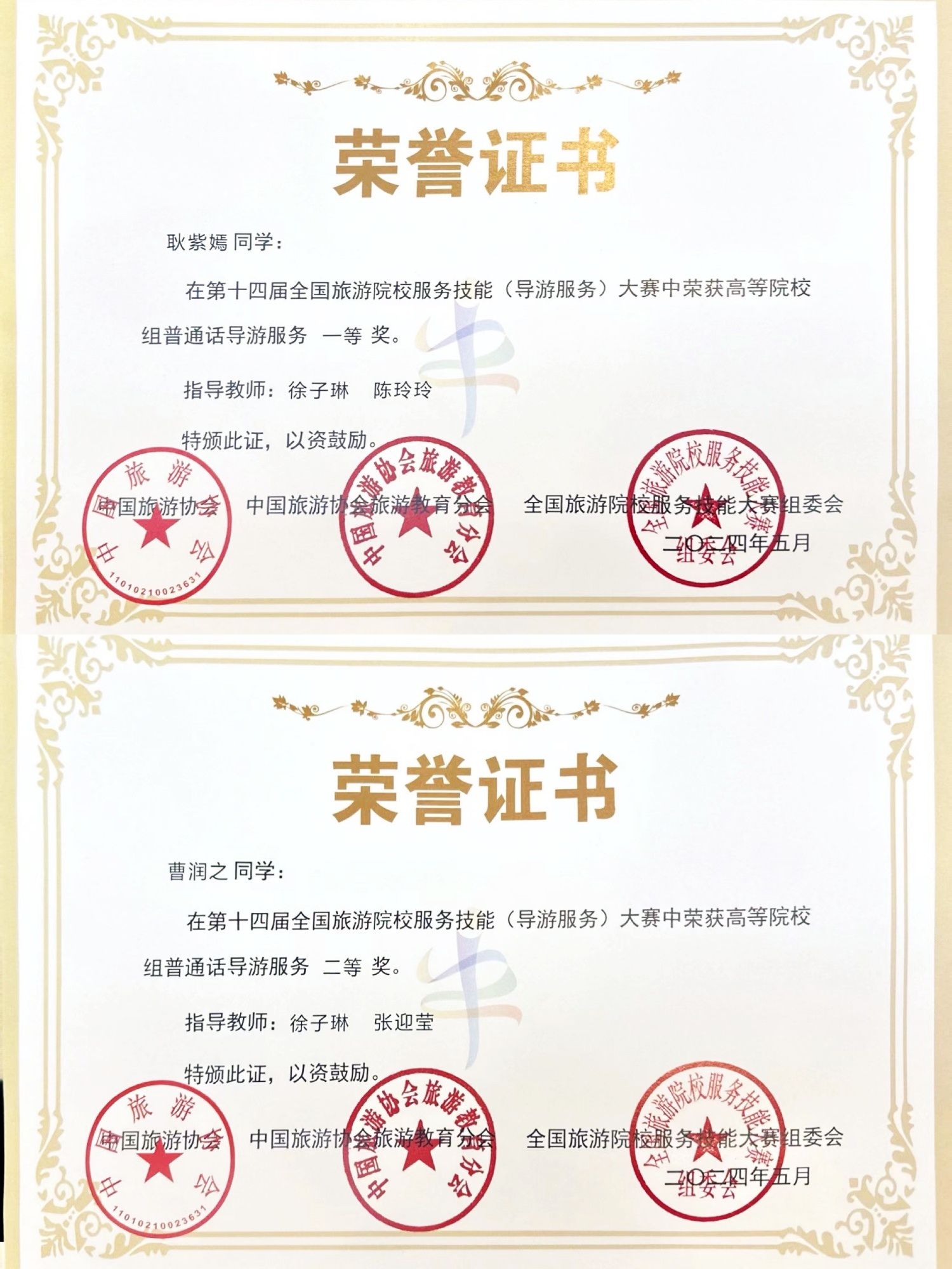 为深入学习贯彻党的二十大精神,切实落实习近平总书记关于旅游发展和高等教育的重要指示,促进旅游教育高质量发展,提升旅游教育支撑旅游业发展的力度,5月23日至5月26日,第十四届全国旅游院校服务技能(导游服务)大赛在郑州举行。我校人文学院旅游管理专业学生耿紫嫣和曹润之分別斩获高等院校普通话组一等奖和二等奖,教师徐子琳、陈玲玲和张迎莹获指导教师奖。