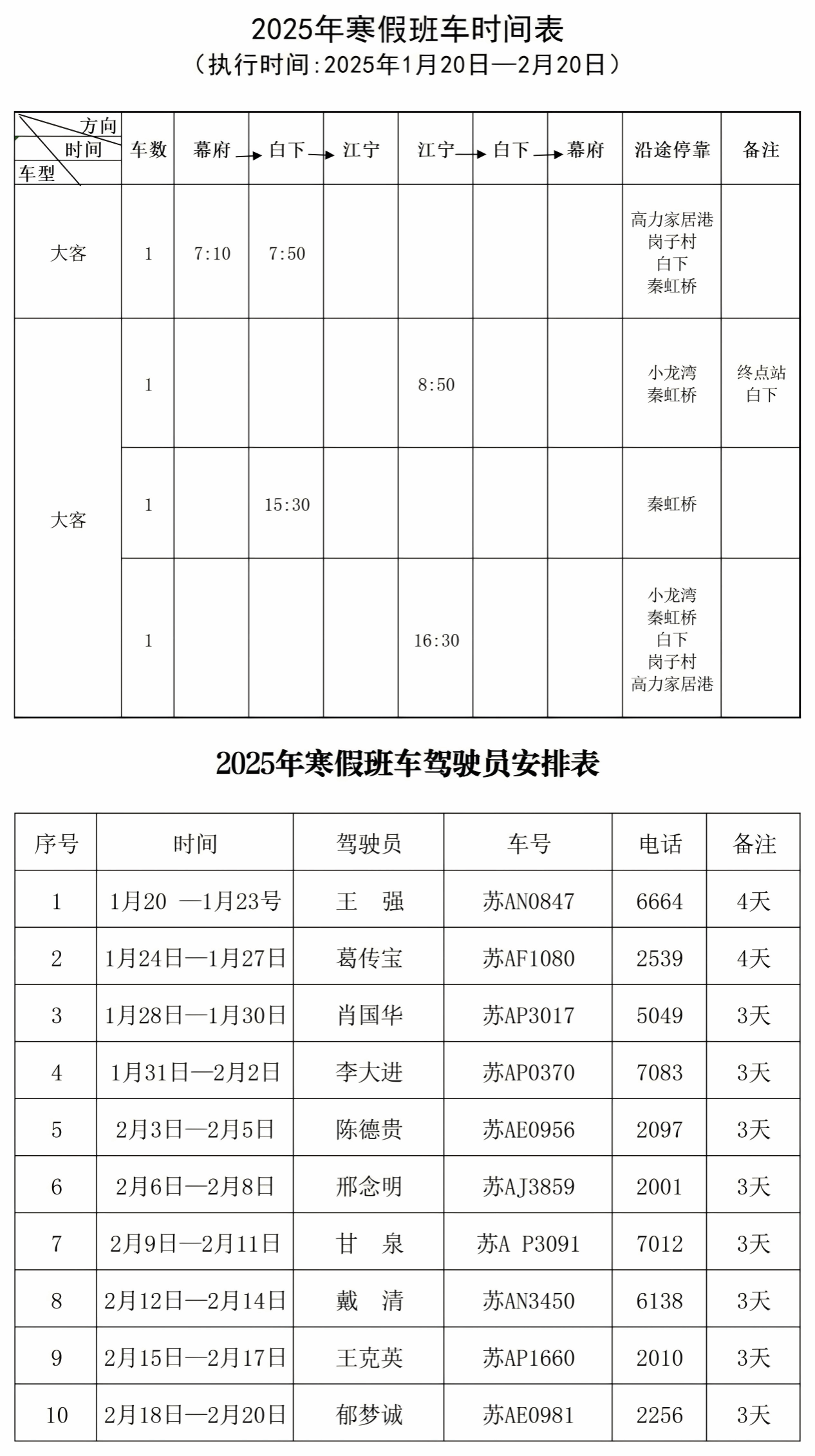 根据学校工作安排,现将2025年寒假班车时间安排公布如下: