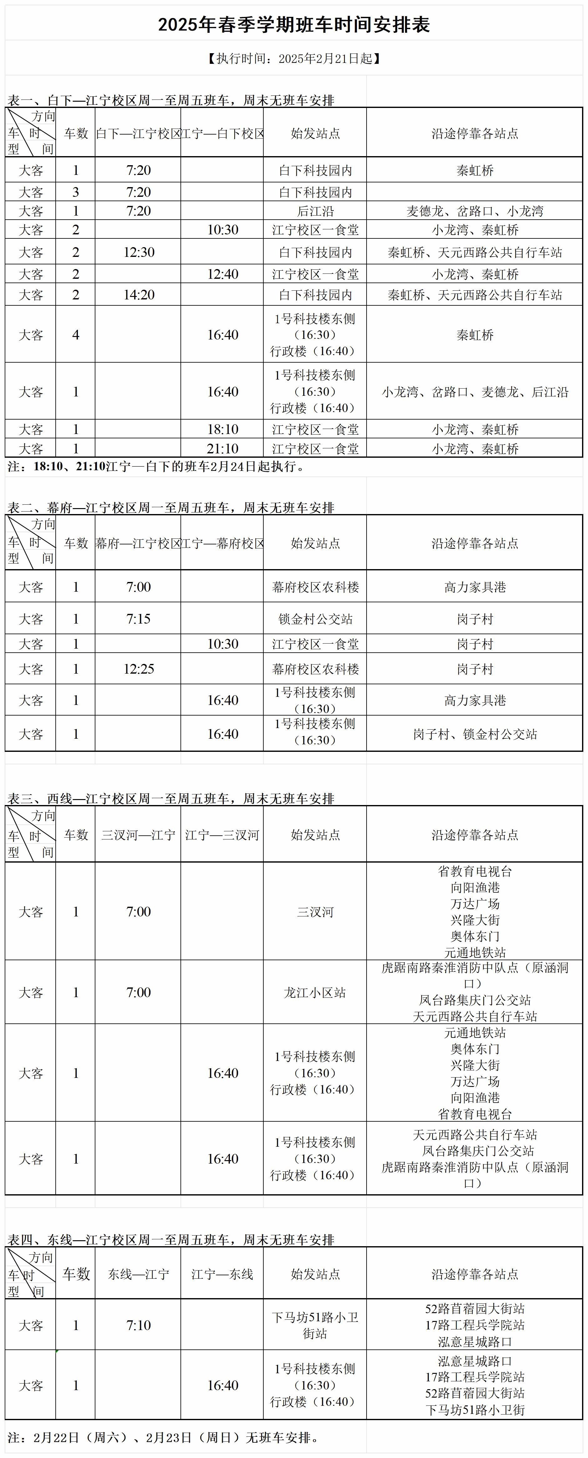 1.该安排自2月21日起执行(2月22日、2月23日为周末,无班车),江宁校区至地铁站接驳班车及18:10、21:10江宁校区至白下校区班车自2月24日起执行;