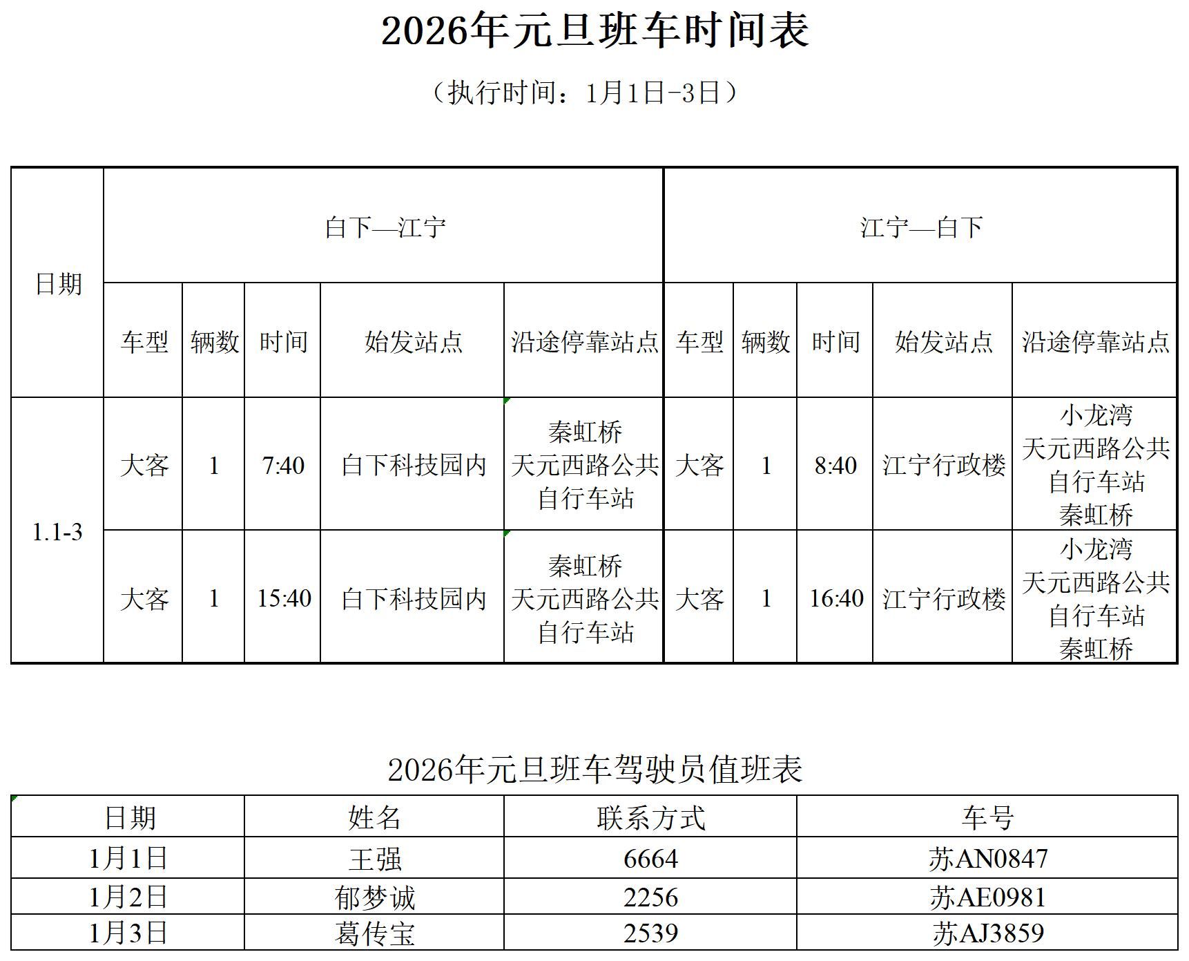 根据2026年元旦放假安排,现将2026年元旦班车时间安排(1月1日-3日)公布如下: