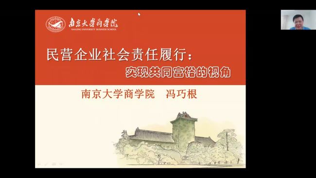 6月1日下午,南京大学博士生导师冯巧根教授应邀做客金科学术讲堂,为我校师生作了题为《民营企业社会责任履行:实现共同富裕的视角》的在线学术报告,商学院全体教师与本校部分师生聆听了报告。报告由商学院副院长史新和主持,科技处刘磊处长致欢迎辞。