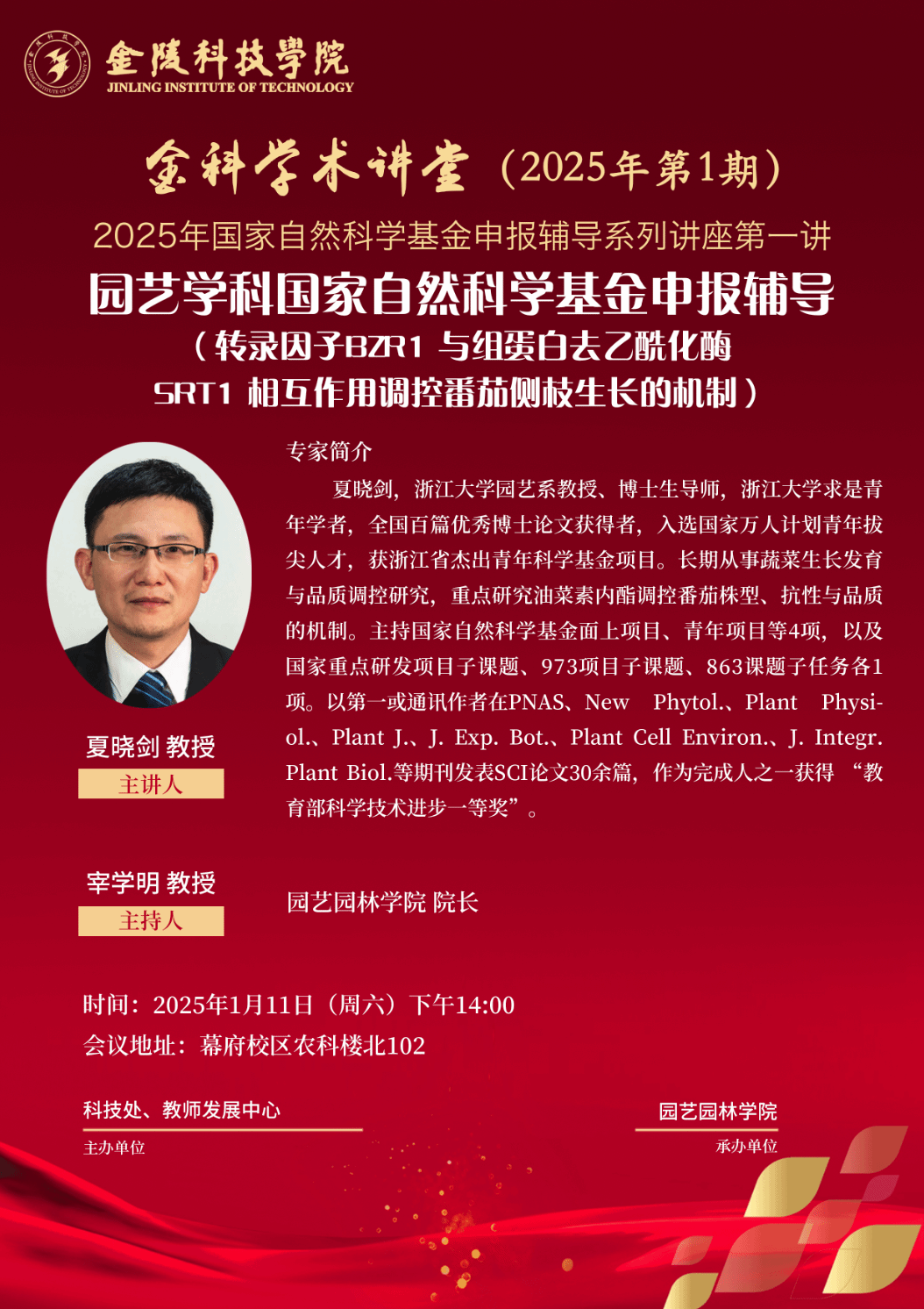 开云(中国)“金科学术讲堂——园艺学科国家自然科学基金申报辅导(转录因子BZR1与组蛋白去乙酰化酶SRT1相互作用调控番茄侧枝生长的机制)”学术报告的通知